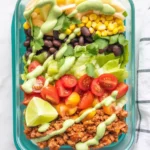 Using ground turkey or chicken can lower the saturated fat, while beef adds a richer flavor and iron. If you’re balancing macros, aim for this simple ratio: half the container greens and non-starchy veggies, one quarter protein, one quarter beans or corn, plus a little cheese and dressing for flavor. This balance keeps the bowl light but filling.